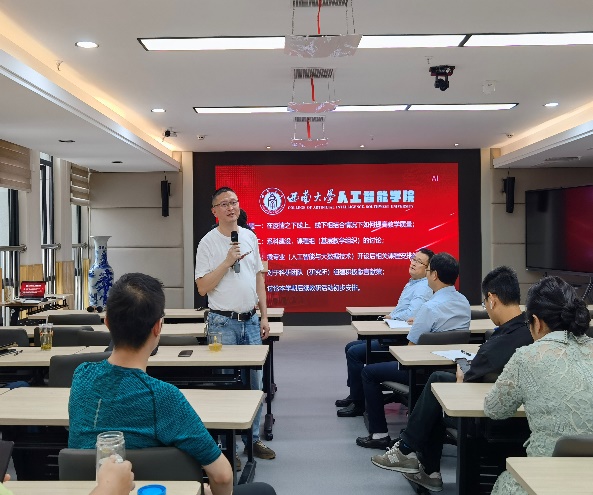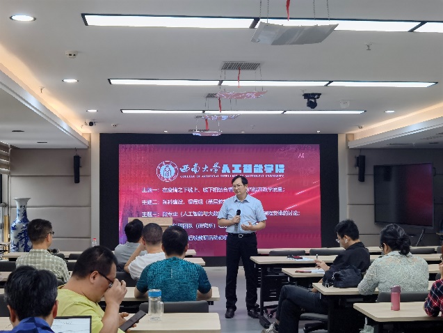 首先,陈枫主任介绍了本次教研活动相关主题安排,并就疫情当下师生最为关心和密切关注的线上教学这一主题进行深入探讨。袁建军老师、李生林老师等就本学期线上授课情况提出了自己的宝贵经验和新颖思路与各位老师分享,引发老师们的广泛讨论和思考。后续,陈枫主任组织就课程组、课程群等基层教学组织建设、学院微专业建设以及学院科研团队建设的思路和举措组织讨论,在座老师各抒己见,提出了许多有建设性、实践性的意见和建议,教学研讨活动现场气氛活跃。在研讨环节结束后,学院段书凯院长邀请浙江大学人工智能研究所所长吴飞教授,为学院作“《人工智能导论》课程建设之思考”的主题讲座,内容充实丰富,老师们受益良多。