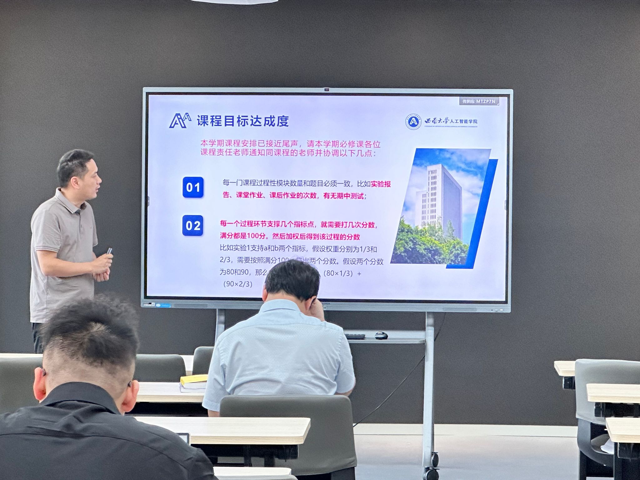 首先,陈枫副院长结合教育数字化的发展,对学校在线课程提质升级工程进行讲解,他分别从目标导向、问题导向、结果导向三个维度对提质作出阐述,鼓励学院教师结合当下人工智能发展趋势、地方产业发展规划,开设和更新适应时代发展的课程,开展数智赋能教育教学研究与实践,强化具有AI特色的实习实践课程。
