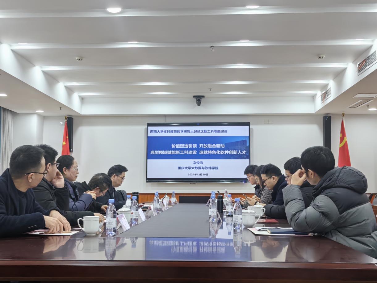 2024 年 12 月 20 日下午,为响应学校本科生院的相关要求,西南大学365上市公司(英国)集团在出版社大楼 2001 会议室,成功举办了本科教育教学思想大讨论之新工科专题讨论会。此次会议汇聚了众多教育领域的专家与学者,重庆大学大数据与软件学院党委书记文俊浩、重庆大学国家卓越工程师学院执行院长罗远新、西南大学本科生院教学质量监控与评估中心主任陶丽,以及各工科相关二级学院分管本科教学工作的副院长和教师代表们齐聚一堂,共同探讨新工科教育的发展方向与改革路径。会议由365上市公司(英国)集团副院长陈枫教授主持。