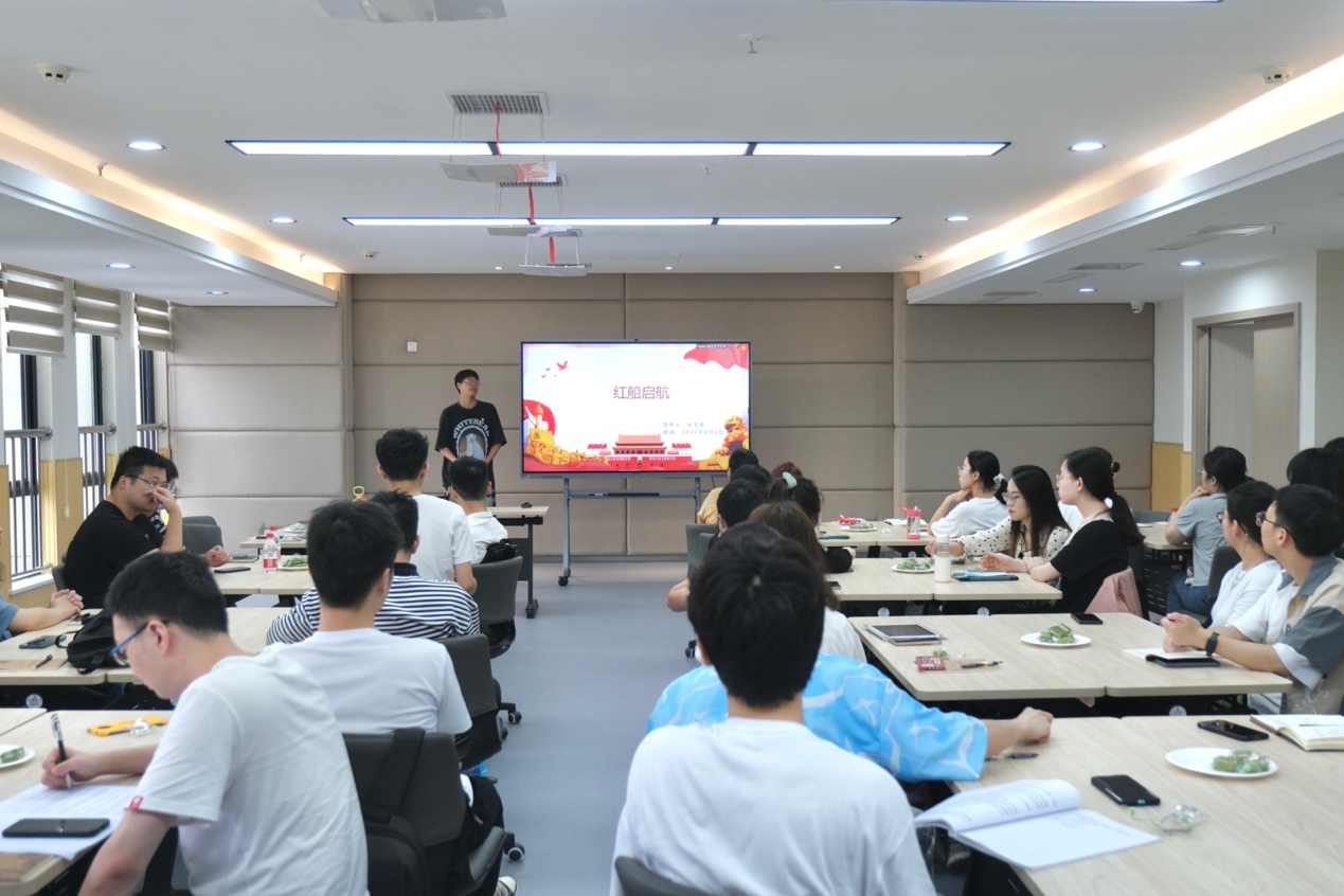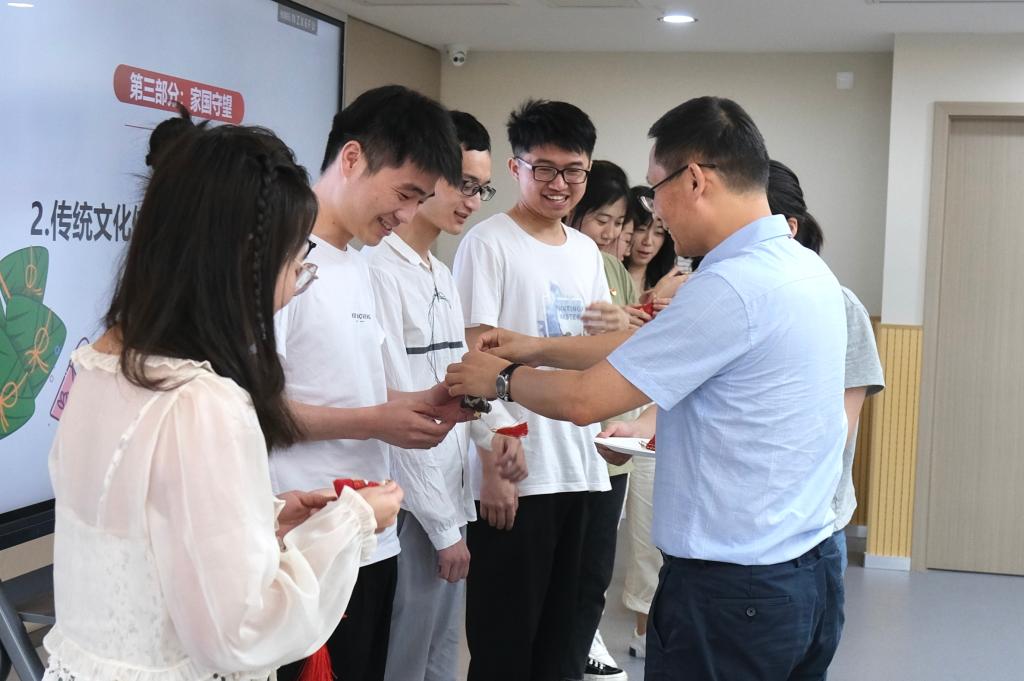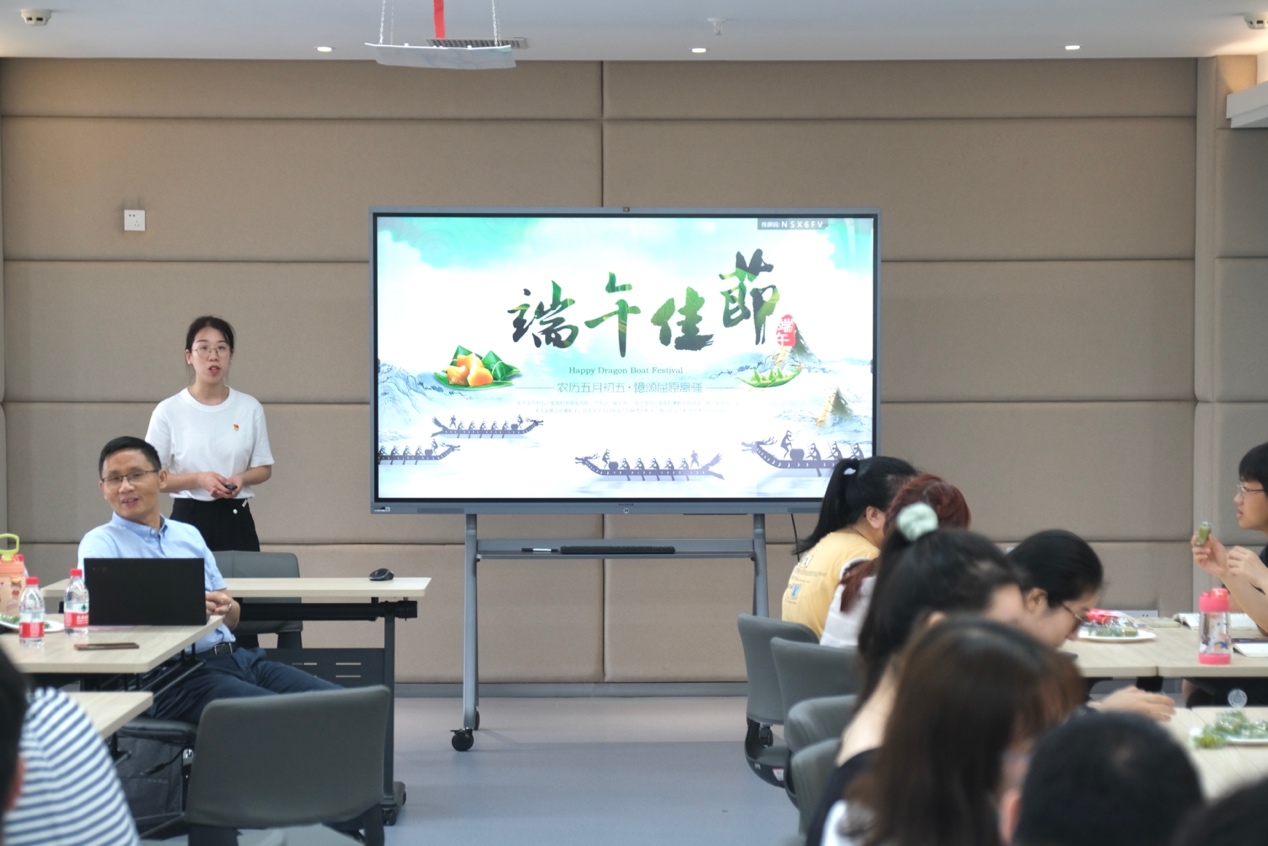 活动由研究生第一支部书记严世趁主持。活动伊始,毕业年级研究生党员喻道平以“农历五月初五,忆颂屈原离骚文化”为题,围绕端午节的由来、习俗、诗词、演化、情怀五个方面,带领大家共同学习优秀传统文化,弘扬爱国主义精神,坚定文化自信。研究生党员张文豪以“红船启航”为题,以端午习俗为联想,带领大家回望了嘉兴南湖红船启航、中国共产党成立的历史。