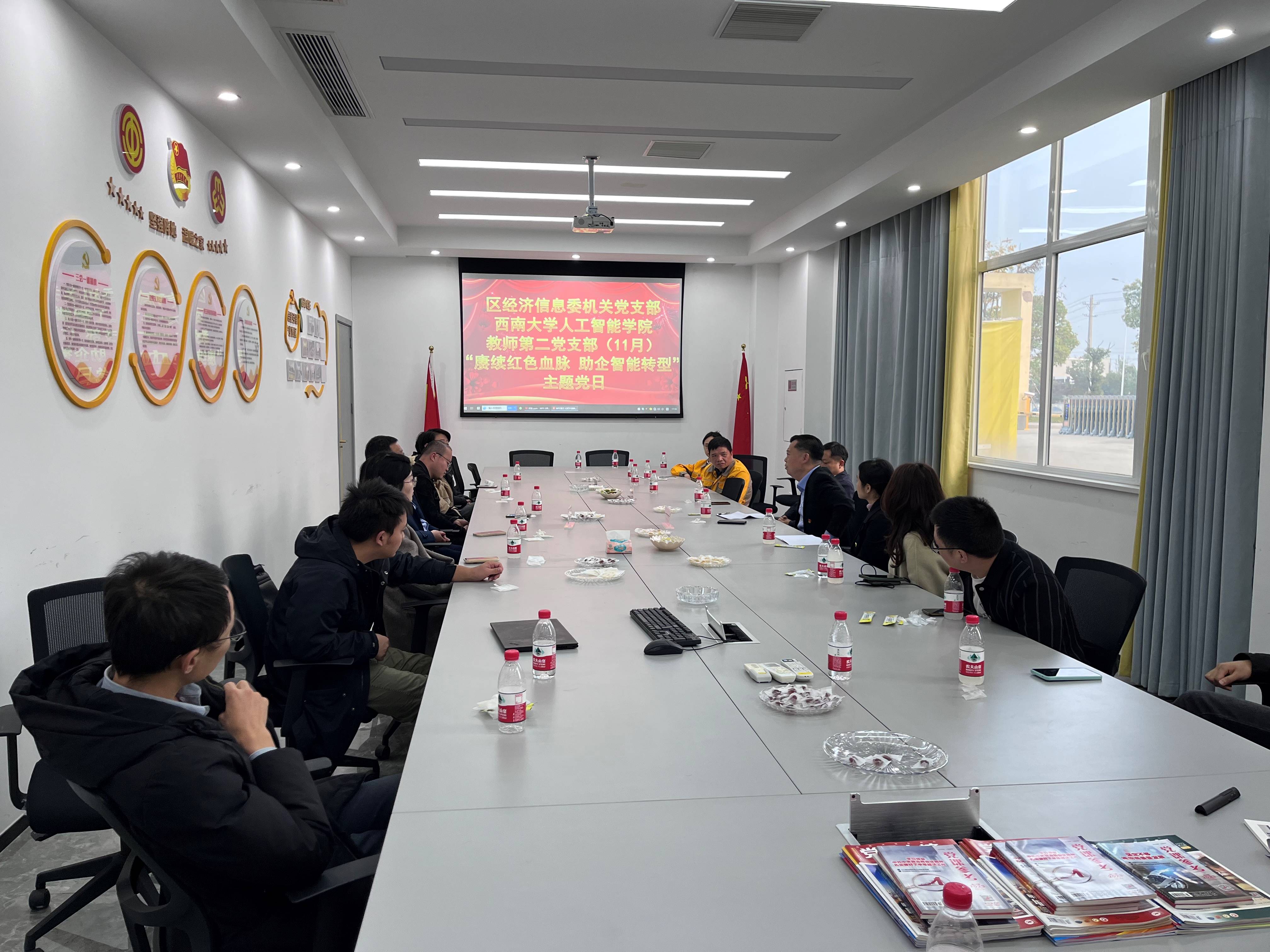 交流研讨话发展。调研结束后,教师第二党支部、潼南区经信委机关党支部和檬泰生物科技有限公司党支部就企业智能转型、加强合作等问题进行了充分交流研讨。学院党委书记夏俊介绍了学院总体情况,支部书记潘东波就学院研发优势作了说明。大家一致认为,数字经济和智能化转型是社会治理、发展的必然选择,高校、地方、企业可通过支部共建、设立党员专家工作室等方式,进一步发挥党建引领作用、推进产学研融合。
