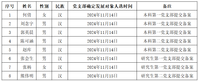 学院本科生何倩等5名同志,研究生张会生3同志入党积极分子教育培养满一年,经相关支部征求党内外意见、支委会(党员大会)研究、学院党委备案,将8名同志(名单见附件)列为发展对象。根据发展党员工作相关要求,现予以公示。