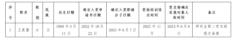 学院研究生王晨露同志入党积极分子教育培养满一年,经相关支部审查基本条件、征求党内外意见、支委会研究、学院党委备案审查,将该同志列为发展对象。根据发展党员工作相关要求,现予以公示。