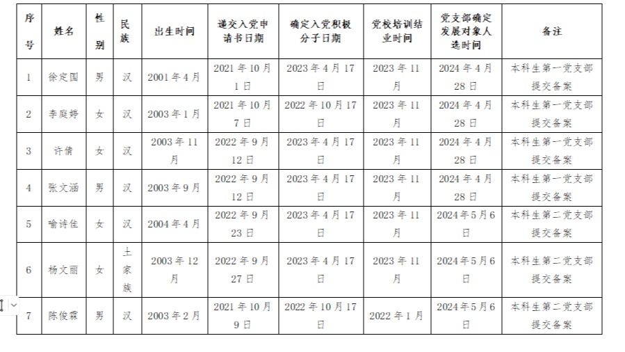 学院本科生徐定国等同志入党积极分子教育培养满一年,经相关支部审查基本条件、征求党内外意见、支委会研究、学院党委备案审查,将该同志列为发展对象。根据发展党员工作相关要求,现予以公示。