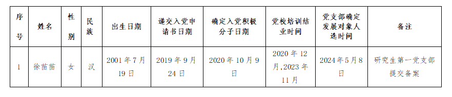 学院研究生徐苗苗同志入党积极分子教育培养满一年,经相关支部审查基本条件、征求党内外意见、支委会研究、学院党委备案审查,将该同志列为发展对象。根据发展党员工作相关要求,现予以公示。
