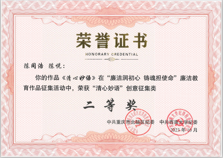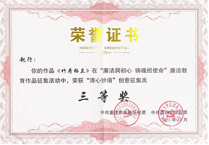 为深入学习宣传贯彻党的二十大精神,落实党中央《关于加强新时代廉洁文化建设的意见》要求,围绕落实立德树人根本任务,纵深推进全面从严治党,重庆市北碚区纪委监委、西南大学纪委联合开展“廉洁润初心 铸魂担使命”廉洁教育作品征集活动。