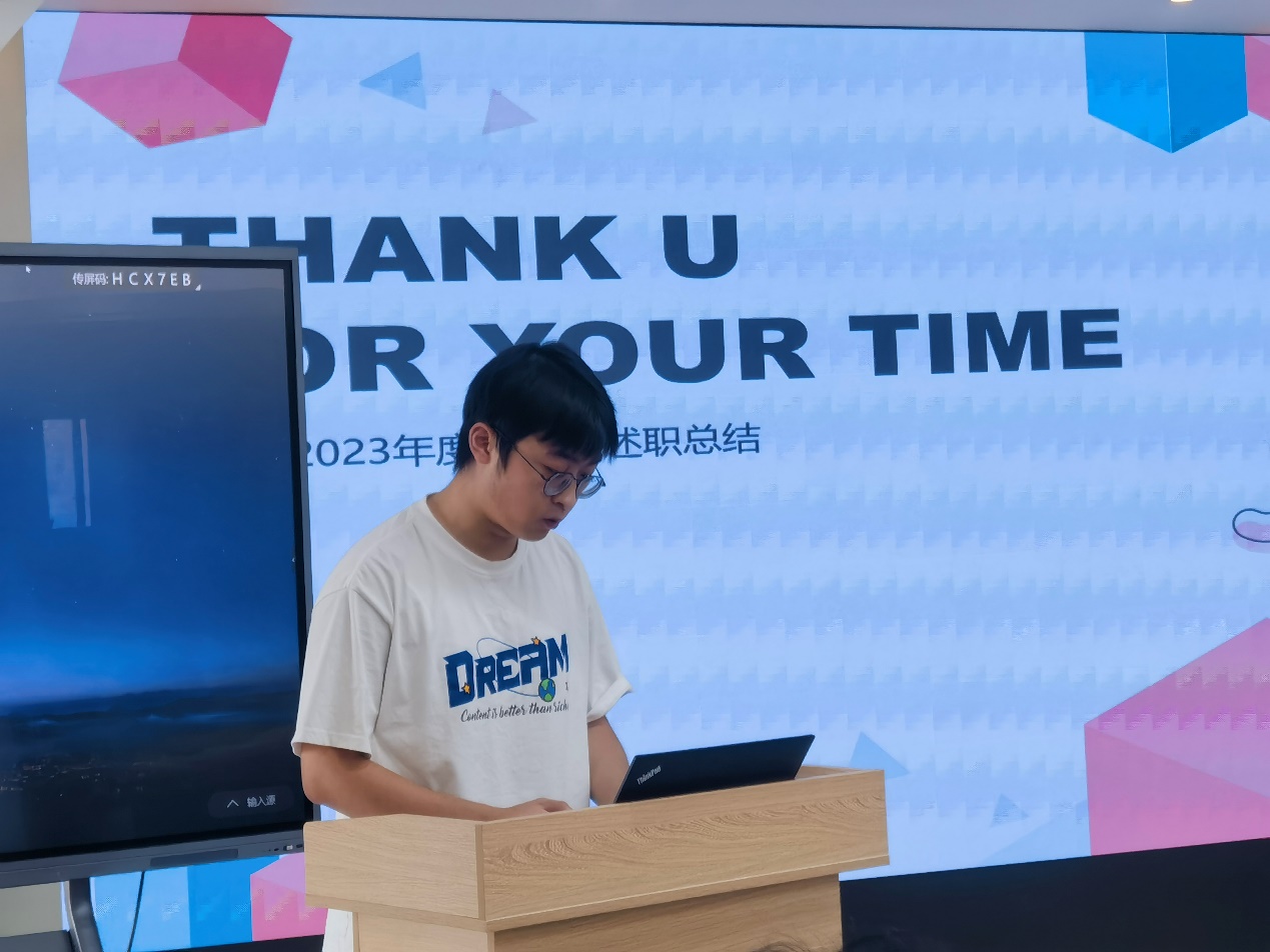第四届团委学生会团委副书记吕硕进行述职总结。他从个人思想政治学习、个人专业课程学习、团学工作总结回顾、团学经验归纳反思四个方面切入,从各项活动的细节中总结了成功经验,并提出不足及解决办法,呼吁大家满怀希望的投入未来的生活,在热爱与希望中不断进步。