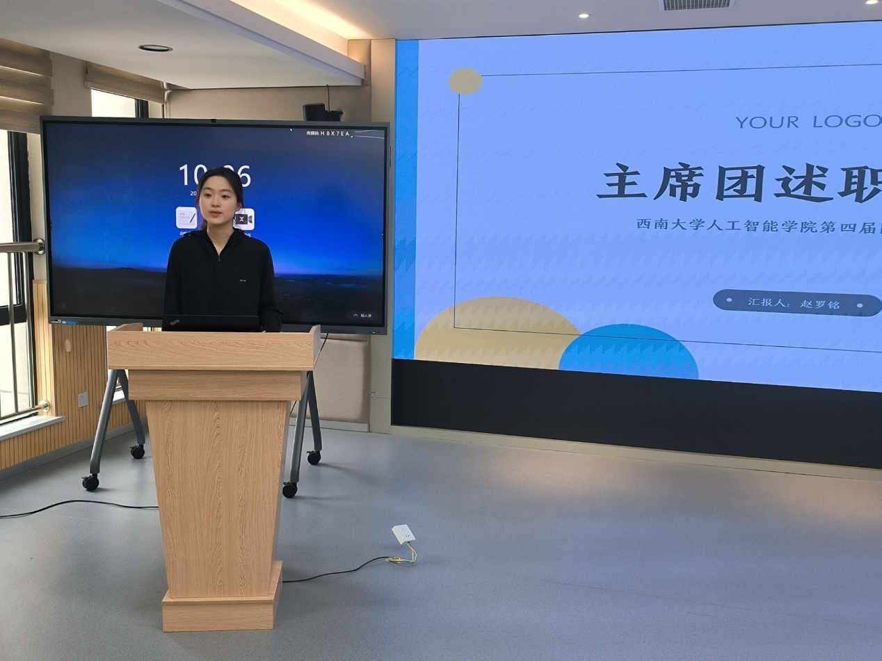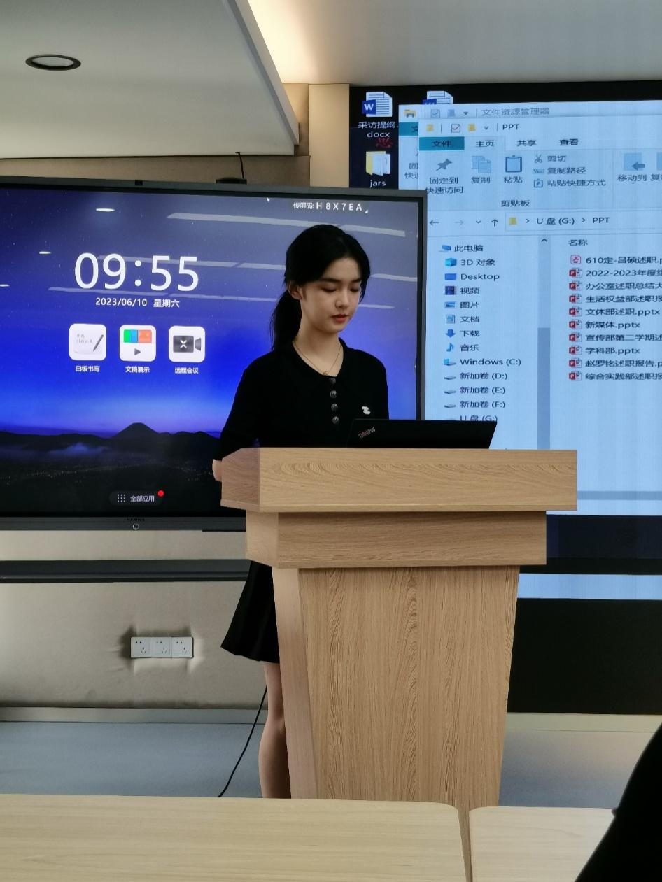 第四届团委学生会执行主席赵罗铭在述职总结中回顾了过去一年主席团成员参与的各项团学活动,从学院宣传与特色活动等方面作为切入点,向有意留任主席、部门负责人的同学抛出疑问,表示希望新一届团委学生会成员针对性的找出重点并进行优化。最后,她提出我院团委学生会应“以服务为中心,以沟通为重心”,谱写更绚丽的新篇章。