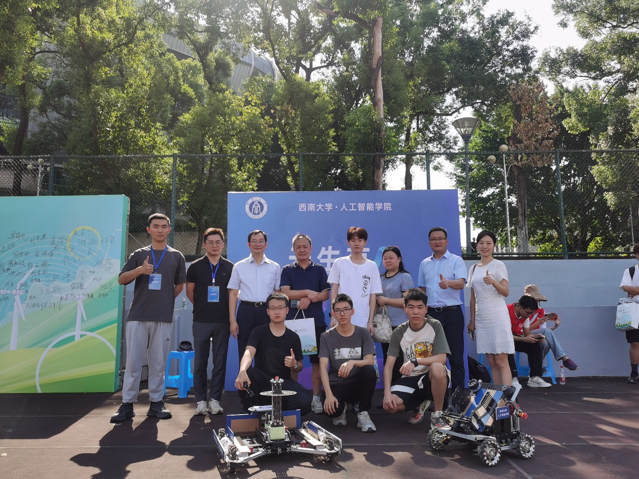 (学院领导和机器人战队与新生在365上市公司(英国)集团立牌前合影)