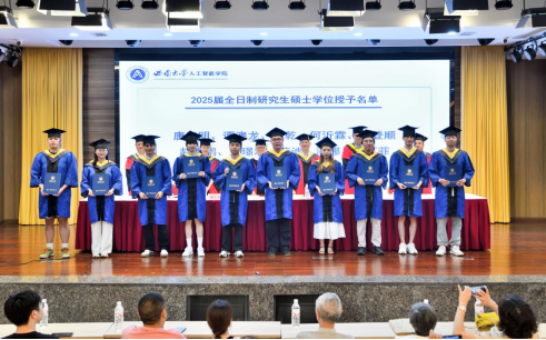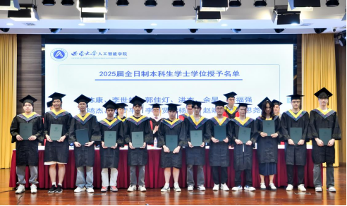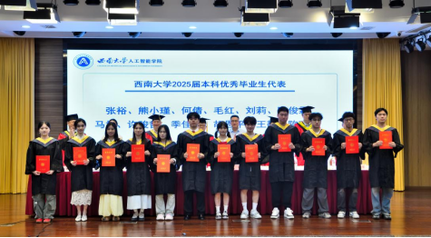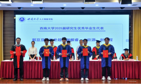 在毕业典礼上,学院教师代表、毕业年级班主任钟明洋老师向同学们送上热烈祝贺,希望大家坚守初心、勇于担当,保持终身学习,感恩他人,豁达面对起伏;母校永远是坚实后盾,愿同学们以“不惧挑战,主宰战场”的勇气,书写辉煌人生,前程似锦。数据科学与大数据技术专业本科毕业生陈俊霖、计算机科学与技术专业硕士毕业生张世超作为毕业生代表发言。陈俊霖在致谢母校、师长与同窗的同时,回顾四年与学院共成长的求学点滴,感悟技术需融入人文关怀与社会责任感的真谛,愿毕业生们携 “天生路 2 号” 的烙印奔赴未来,以智能之力服务大众、不负时代。张世超以感恩之心回顾三年求学中学习科研、竞赛实践与校园生活的成长点滴,呼吁在 AI 时代永葆终身学习热忱,愿毕业生们前程似锦、为社会发展贡献力量。