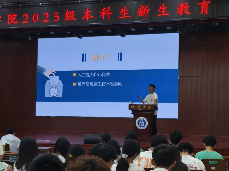 随后,学院孙一博老师针对安全教育作专题讲座。他围绕学生日常生活的“衣、食、住、行”四个方面展开讲解。饮食方面,他建议学生优先选择校内食堂,审慎辨别外卖食品;住宿方面,强调安全用电,防范火灾风险;出行方面,提醒学生遵守交通规则,行走时不佩戴耳机、不沉迷手机,确保自身安全。此外,他还针对外出活动提醒学生保持警惕,谨防不明旅行团和各类诈骗陷阱。针对实验室安全,他强调必须严格遵守规章制度,做到规范操作设备。在集体活动中,应避免盲目聚集,远离人流密集区域。谈及恋爱关系时,他建议学生理性看待感情,建立健康积极的交往模式,并树立共同发展的长远目标。最后,孙一博老师寄语新生提高安全意识,平稳度过大学生活,广泛结交益友,收获充实而有意义的大学时光。