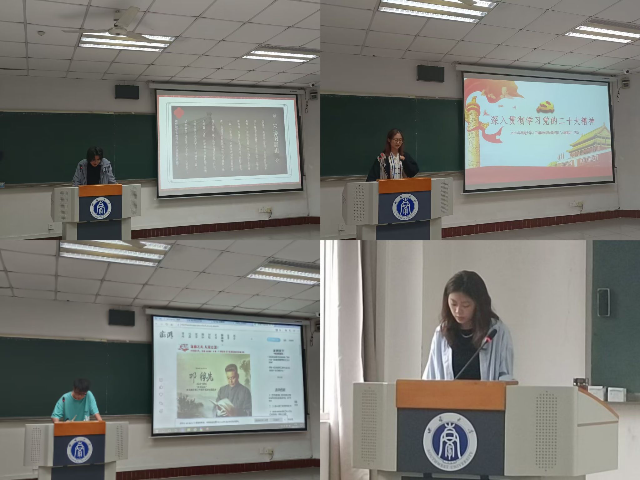 各年级同学百花齐放,宣讲内容丰富,充分展现AI学子的风采。 2021级围绕“革命精神”和“爱国主义精神”展开分享,将同学们带回到那段峥嵘岁月,从中感受老一辈革命家的优秀品质与精神风貌;2022和2023级则主要以“党的二十大精神”、“科学精神”为主题向同学们宣讲,使大家深刻领悟共产党人的超越自我、拼搏奉献的热情与毅力,深入地了解和学习党的最新政策与方针。