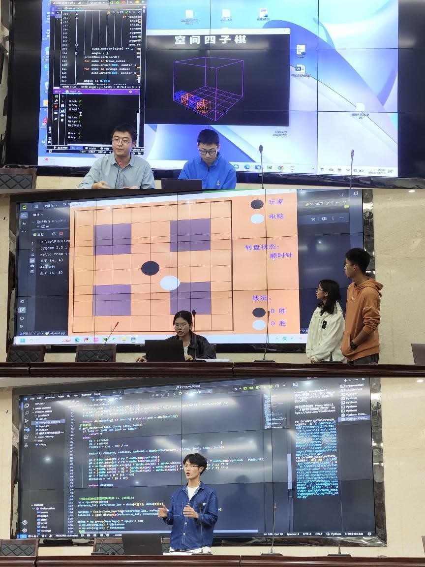 Python现场编码要求选手们在一小时内,在不借助网络的前提下完成自己的作品,随后进行筛选,在32组中选择15组进行后续的3分钟展示和答辩。这不只是考察选手们的编码速度,更是考察选手们的创新能力。在1个小时内,选手们独立完成代码的编写,设计出自己独特新颖的作品,由学院副教授潘东波,学院教师陈睿、吴鹏程组成的评委团针对选手们的作品进行点评。