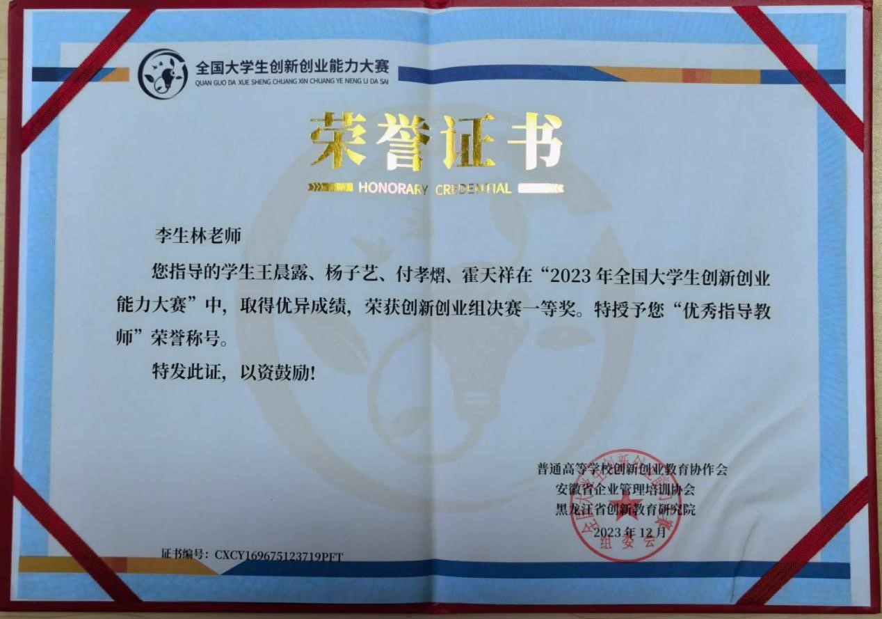 在决赛创新创业组别中,评审专家组依据作品的创新性、实用性、市场潜力等多个维度进行了全面的评审,由李生林教授指导的王晨露、杨子艺、付孝熠、霍天祥团队荣获全国一等奖,同时,李生林教授被评为优秀指导教师。