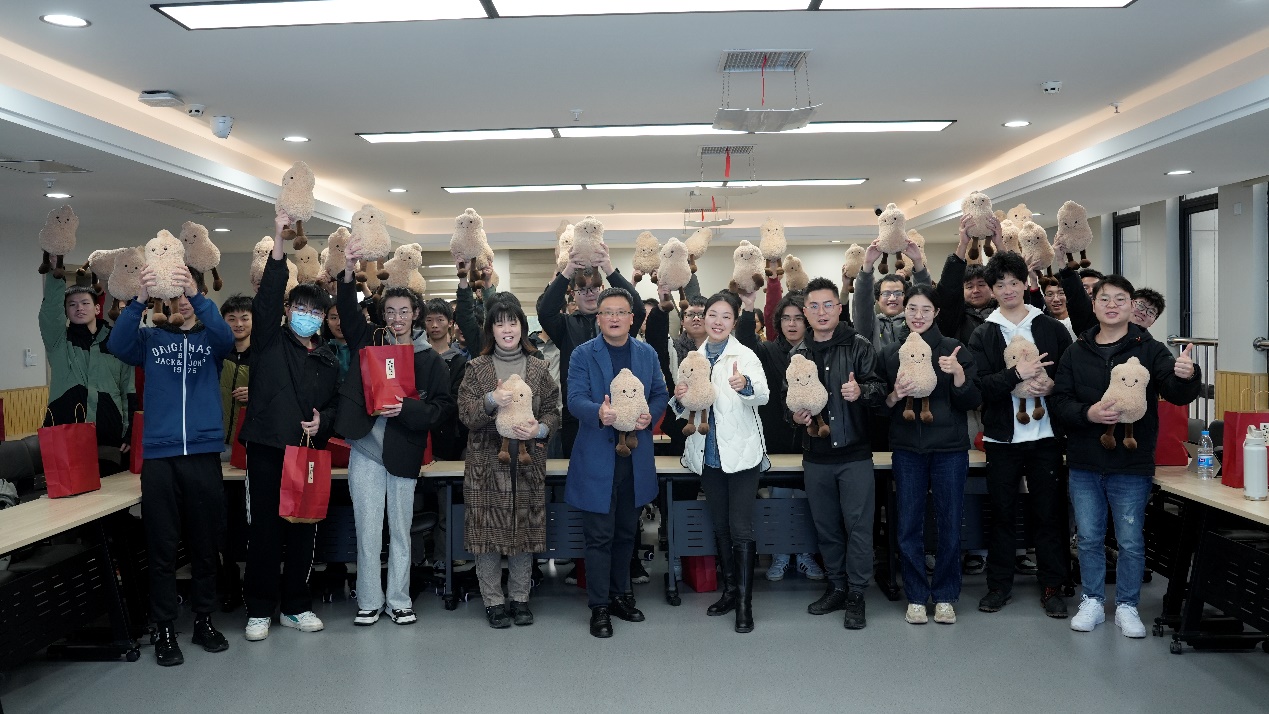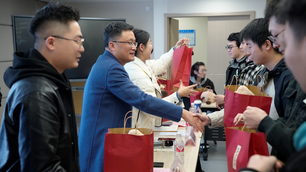 交流结束后,学院领导、老师向考研学生赠送“考研加油包”。花生玩偶——寓意“好事发生”,旺仔牛奶——寓意万事兴旺,文具套装——为学子们提供便利与支持,饱含了学院的深切关爱与殷切期望。同学们高举玩偶,共同留下了珍贵的合影。