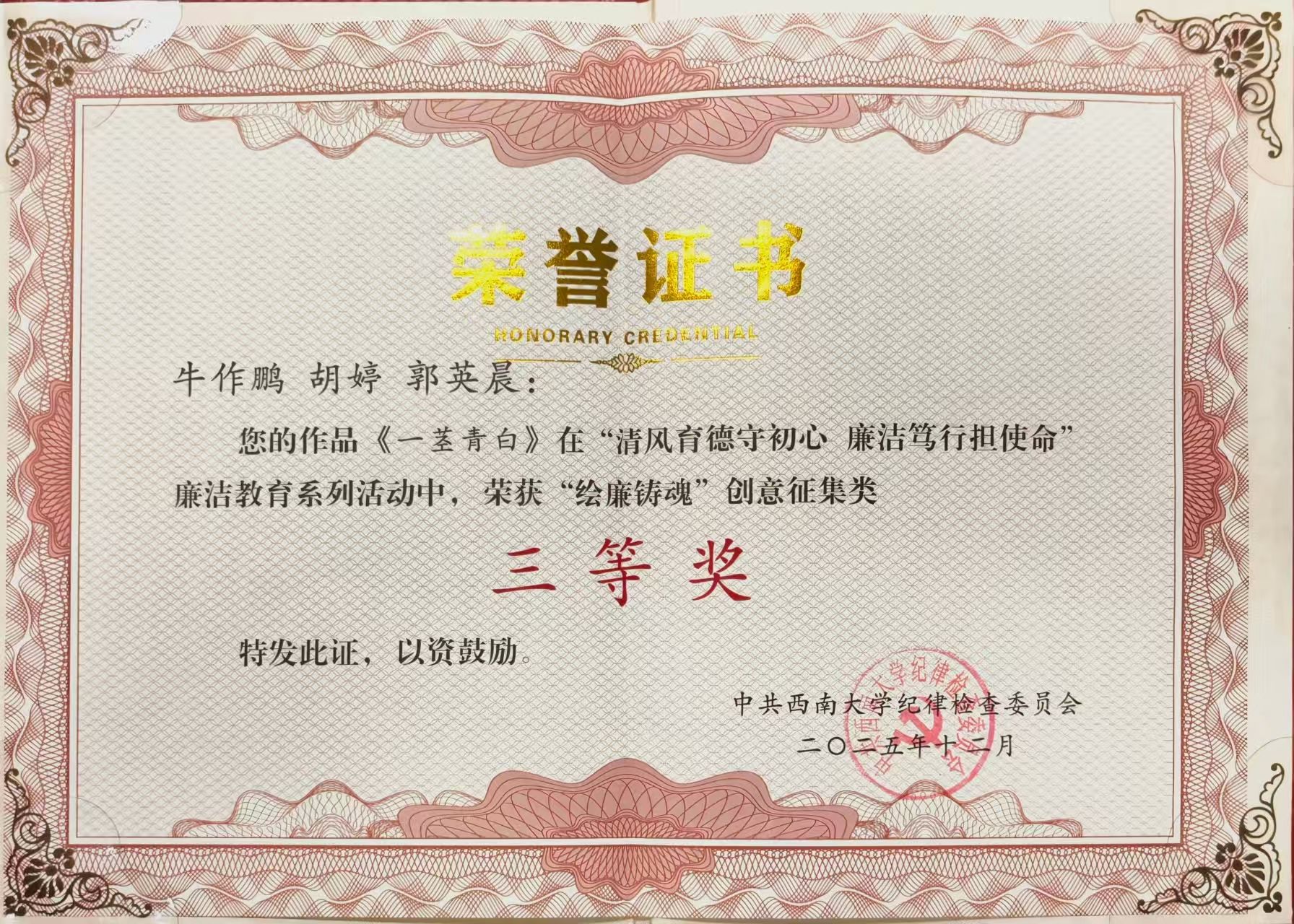 近日,在学校纪委开展的“清风育德守初心,廉洁笃行担使命”廉洁教育作品征集活动中,学院纪委组织推荐的两项作品获得表彰,本科生同学代熠玺创作的《墨韵廉心·清泉映梅》,及本科生同学牛作鹏、胡婷、郭英晨共同创作的《一茎青白》分别荣获学校“绘廉铸魂”创意征集类二等奖、三等奖。