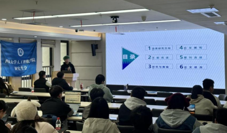 活动伊始,佘春燕结合自身学术经历,详细讲解了从科研选题到论文写作的完整流程。他强调扎实研究与创新思维的重要性,要通过学习优秀文献找到学习和工作的创新点。吴付军以“成长心得及经验浅谈”为题,从学术论文、学科竞赛和科研项目三个方面展开分享。他谈到快速阅读和熟悉研究领域的方法,强调避免陷入“自我感动”的误区,并结合自身经历详细介绍了学科竞赛的准备和意义。曾籽言围绕研究方向选择、文献阅读和论文撰写分享了自己的经验,强调要提前制定个人未来规划,以目标导向提升研究工作影响力和个人职业发展路径的契合度。