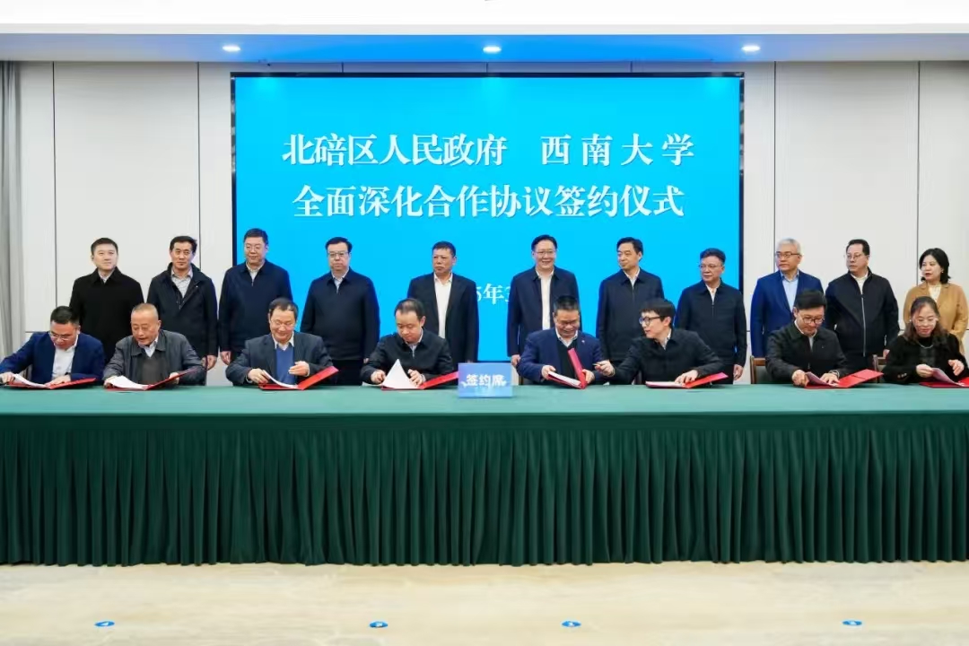 张卫国向区校合作签约表示祝贺,对北碚区长期以来倾力支持学校发展表示衷心感谢。他指出,西南大学始终锚定建成教育强国战略目标,深入学习贯彻习近平总书记关于教育的重要论述和视察重庆重要讲话重要指示精神,主动融入成渝地区双城经济圈、重庆“416”科技创新战略布局、“33618”现代制造业集群体系建设等部署,统筹推进教育科技人才一体发展,加快建成综合实力中西部领先的高水平研究型大学。多年来,学校与北碚区在多个领域开展了广泛深入的合作,建立了深厚的友谊。借助此次协议签署,希望双方强化创新驱动,推动“四链”深度融合;聚焦人才共育,共同建设人才集聚新高地;深化文教共建,打造具有北碚辨识度的文化教育品牌。他表示,学校将以高层次战略合作、高质量人才培养、高水平科技创新、高品质文化服务为北碚区提供全方位、多层次的智力支持,助力重庆“六区一高地”建设和北碚区迭代升级“12345”体系构架,打造“大学与城市共生共荣”的区校合作新典范。