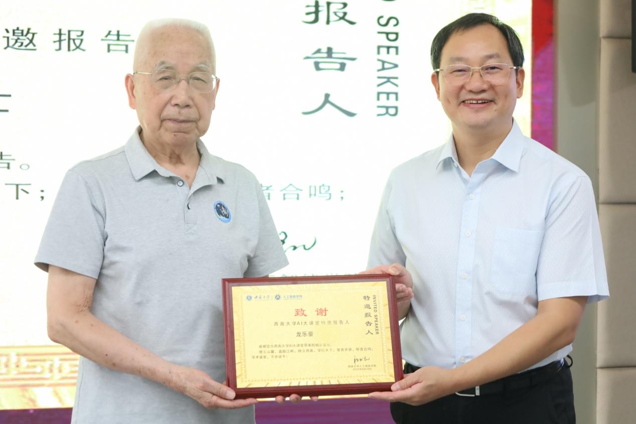讲座结束后,段书凯院长代表学院为专家龙乐豪颁发了“西南大学AI大讲堂特邀报告人”证书,并对他的精彩分享表示衷心的感谢。